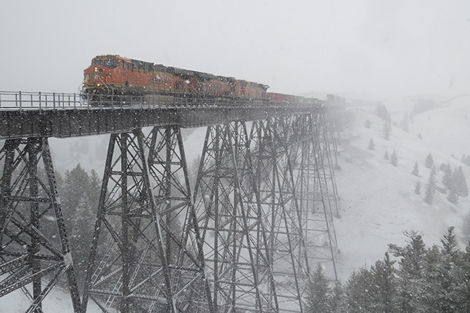 Crossing a snow-covered valley in Glacier National Park, a BNSF intermodal train powers across a towering steel trestle, framed by falling snow and frosted evergreens. We’re in awe of Assistant Director of Bridge Construction Mike Schaefer’s stunning photo.