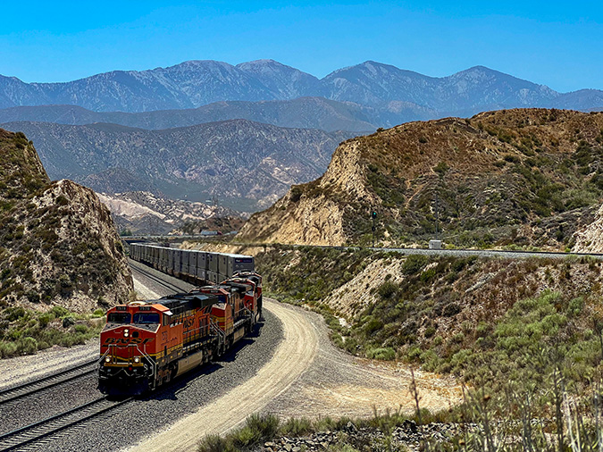 An eastbound BNSF intermodal train climbs through Cajon Pass near the historic Alray Tunnel, weaving through hills under a wide California sky. Conductor Aaron Steele has a good eye.